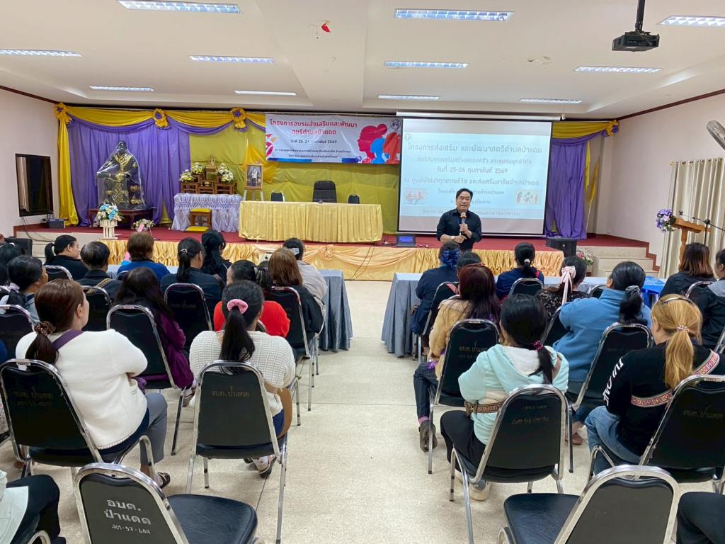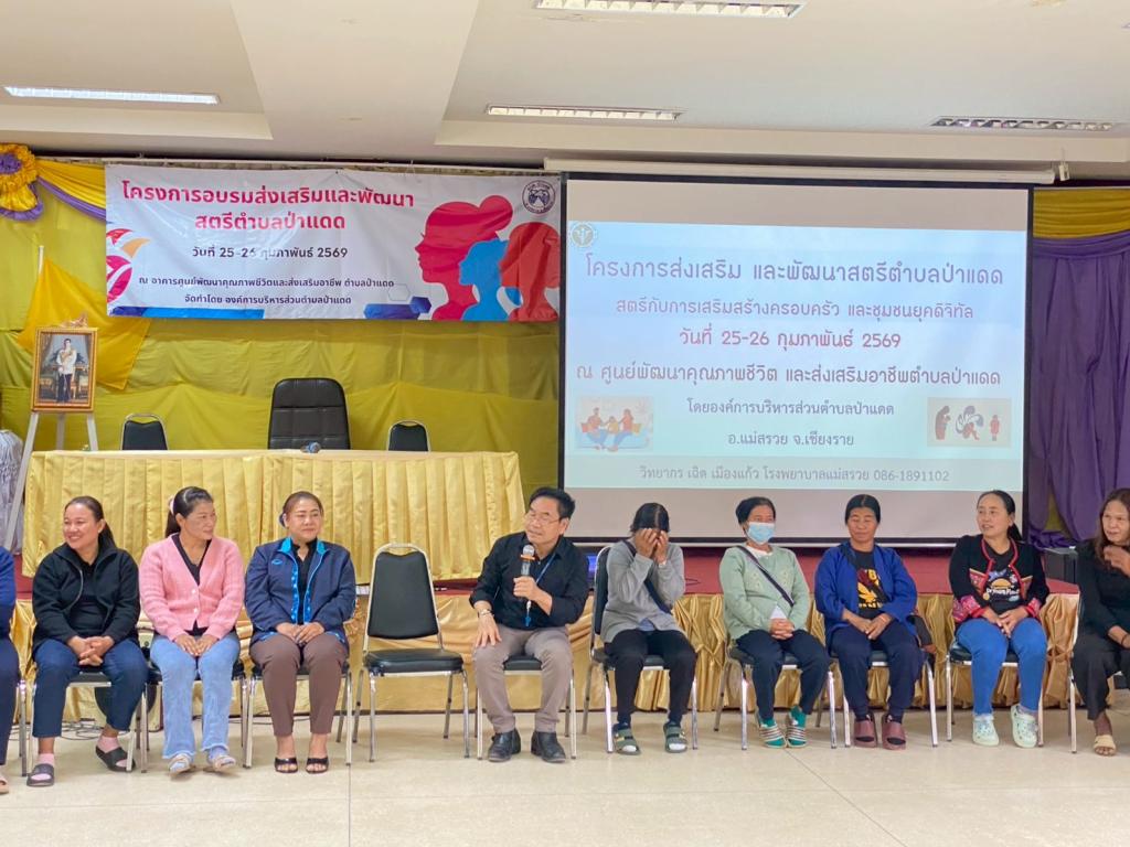 งานพัฒนาชุมชน ได้ดำเนินการจัดโครงการอบรมส่งเสริมและพัฒนาสตรีตำบลป่าแดด โดยได้รับเกียรติจาก นายเฉิด เมืองแก้ว บุคลากรจากโรงพยาบาลแม่สรวย มาเป็นวิทยากร รุ่นที่ 2 วันที่ 26 กุมภาพันธ์ 2569 ได้แก่ กลุ่มพัฒนาสตรี หมู่ที่ 12-22 ณ ศูนย์พัฒนาคุณภาพชีวิตและส่งเสริมอาชีพตำบลป่าแดด โดยมีวัตถุประสงค์เพื่อให้สตรี แม่บ้าน ได้รับความรู้ทางด้านการเข้าสังคมอย่างถูกต้องและเหมาะสม ส่งเสริมพัฒนาบุคลิกภาพสตรีให้ดีขึ้น ได้เรียนรู้การทำงานเป็นทีมและพัฒนาตัวเองสู่การทำงานแบบมีส่วนร่วม สร้างครอบครัวให้มีความสุข สร้างรอยยิ้ม ลดปัญหาการขัดแย้งในครัวเรือน และสังคมต่อไป