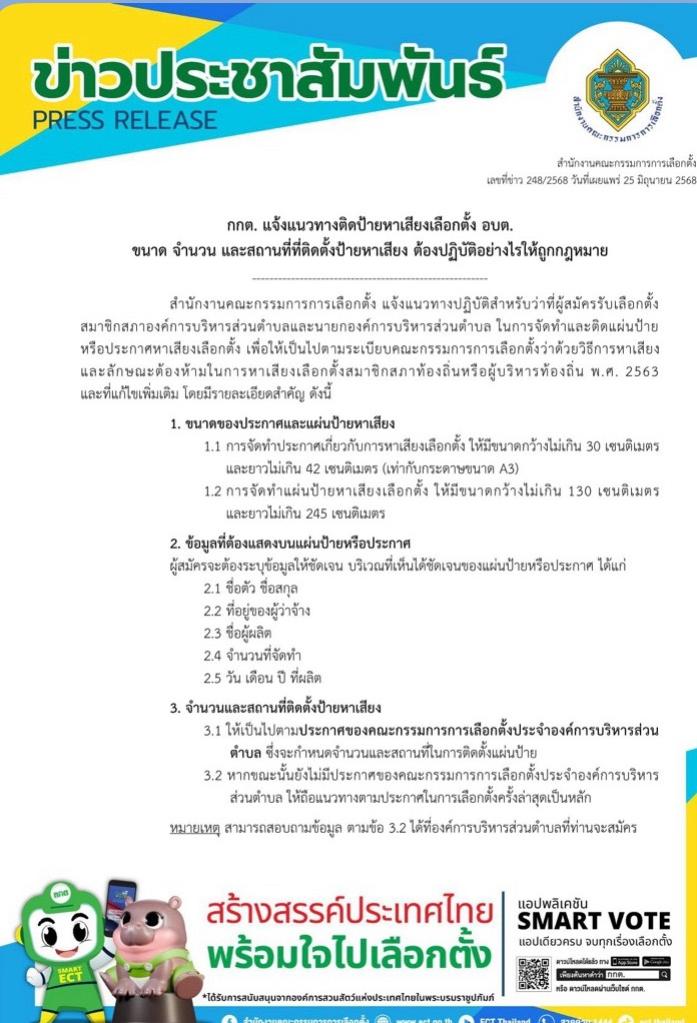 ประชาสัมพันธ์แจ้งแนวทางติดป้ายหาเสียงเลือกตั้ง อบต. ขนาด จำนวน และสถานที่ที่ติดตั้งป้ายหาเสียง...