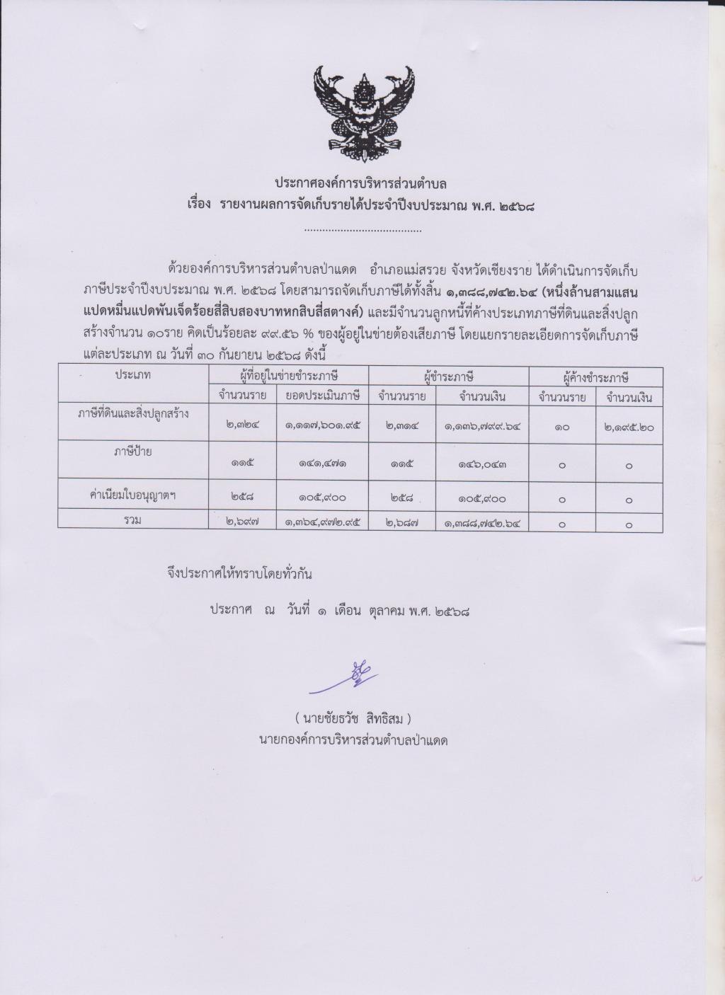 รายงานผลการจัดเก็บรายได้ประจำปีงบประมาณ 2568...
