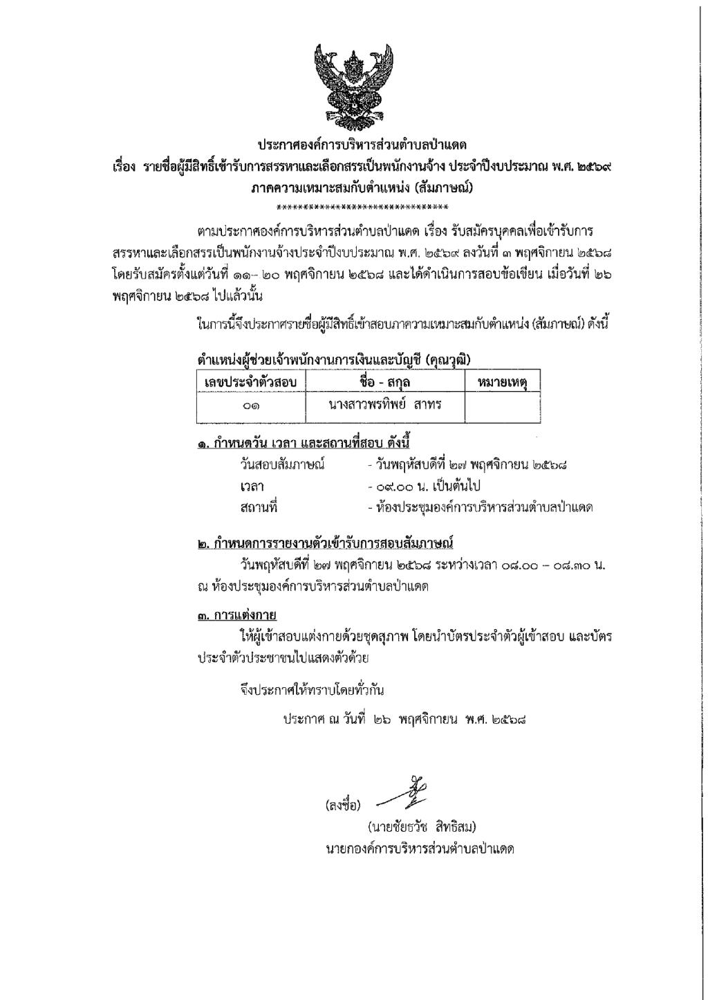 ประกาศองค์การบริหารส่วนตำบลป่าแดด เรื่อง ประกาศรายชื่อผู้ผ่านการสรรหาและเลือกสรรเพื่อบรรจุและแต่งตั้งเป็นพนักงานจ้าง ประจำปีงบประมาณ พ.ศ. 2569...