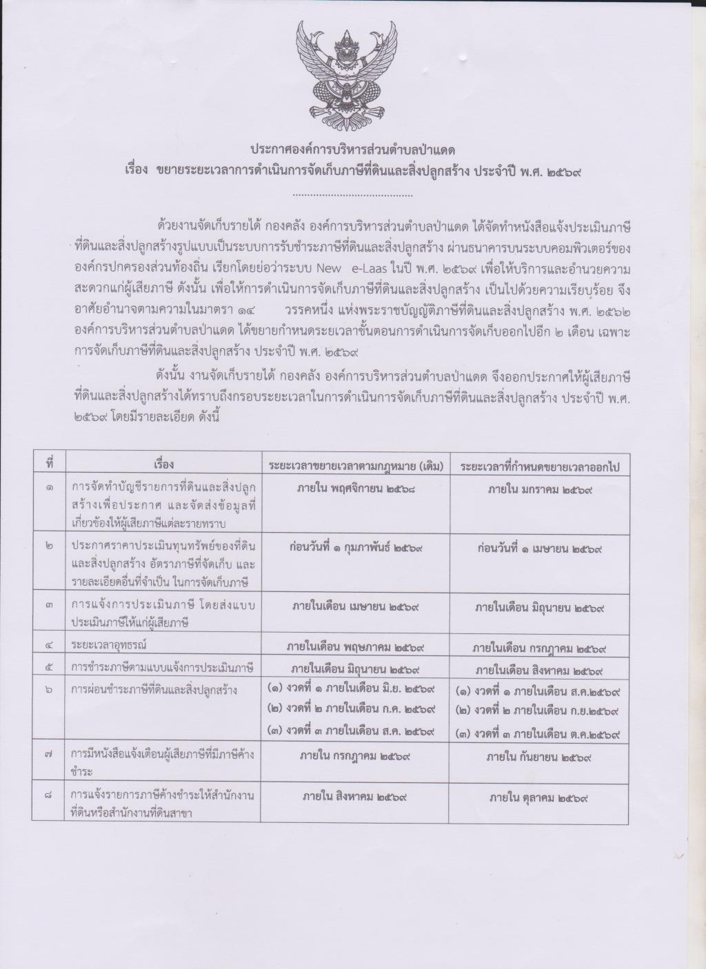 ประกาศ การขยายระยะเวลาการดำเนินการจัดเก็บภาษีที่ดินและสิ่งปลูกสร้าง ประจำปี 2569...